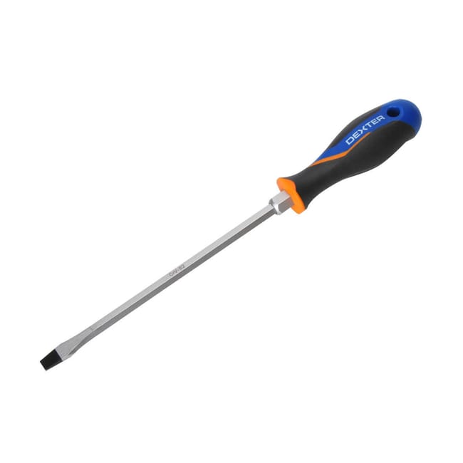 Tournevis Dexter avec lame en chrome vanadium et manche en plastique bi-matière, conçu pour les travaux mécaniques. Offre une garantie de 5 ans. Dimensions : feuille de 200 cm de long.